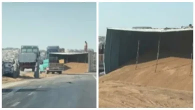 جبل من القمح يغلق الصحراوي.. تفاصيل انقلاب مقطورة بالمنيا (صور)