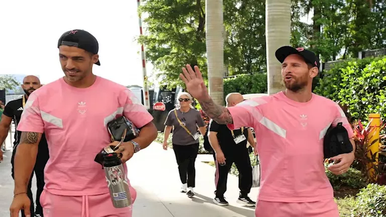 وظهر ميسي خلال وصوله إلى ملعب المباراة رفقة زميله الأوروجواياني لويس سواريز الذي خلال الانتقالات الصيفية لموسم 2023/24.