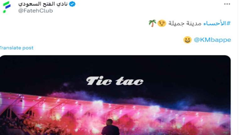 نشرت حسابات نادي الفتح السعودي تصميمًا للنجم الفرنسي الدولي مبابي وكُتب عليه:”Tic Tac”، مُذيلة إياها بتعليق:”الأحساء مدينة جميلة” مع الإشارة لصاحب الـ 25 عاماً.