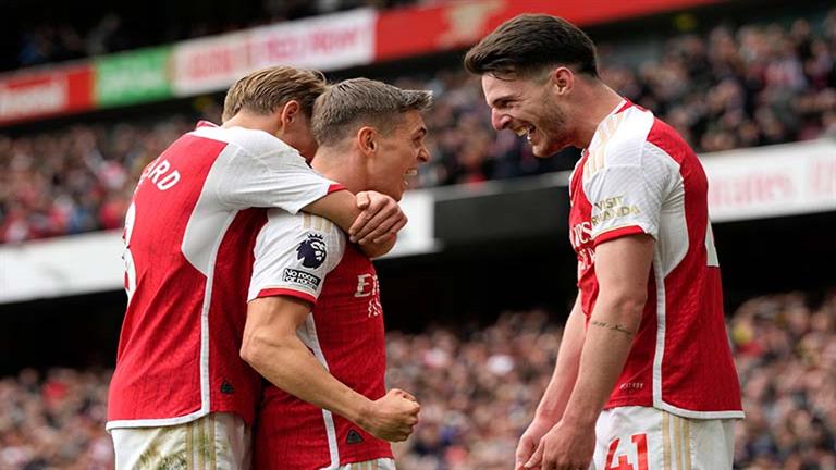 سجل هدف أرسنال الثالث، ديكلان رايس في الدقيقة 90+7.