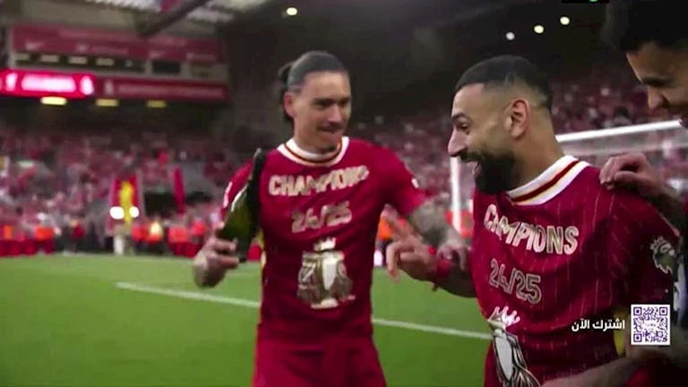 كما ظهر النجم المصري، وهو يحاول الابتعاد عن زميله داروين نونيز، الذي كان يحتفل بأحد زجاجات الخمر وحاول تفريغ المشروب على النجم المصري.
