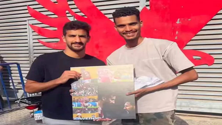حرص أحد جماهير النادي الأهلي، على تقديم هدية تذكارية إلى لاعب وسط الفريق الأول لكرة القدم بالنادي محمد علي بن رمضان، عقب نهاية المران الجماعي للفريق.